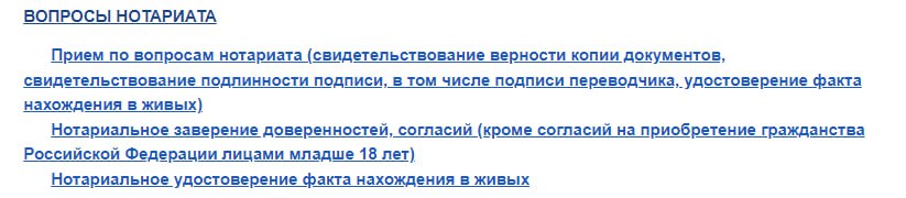 1️⃣ Запишитесь в российское диппредставительство на «прием по вопросам нотариата» (скрин выше), именно в этой категории находится нужное вам полномочие. МИД РФ пока не сообщал о планах выделить эту услугу в отдельную категорию.